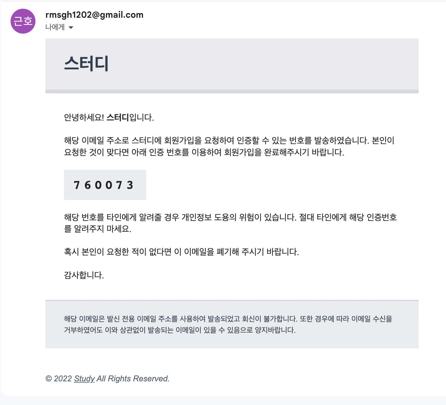 메일로 다음과 같이 회원가입 인증 번호 메시지가 오게된다.