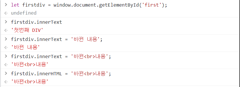 - x.innerText : 요소 x의 내부 텍스트 내용을 가져오거나 지정한다.