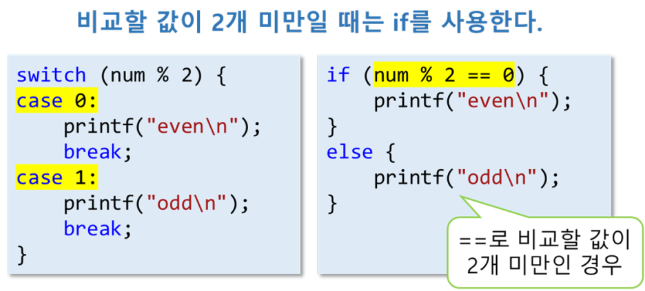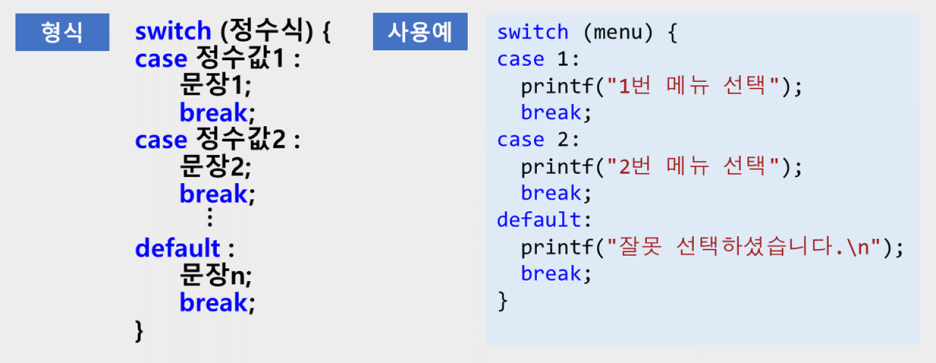 - switch의 ( ) 안에는 정수식만 사용할 수 있으며, 실수나 문자열은 사용할 수 없다.