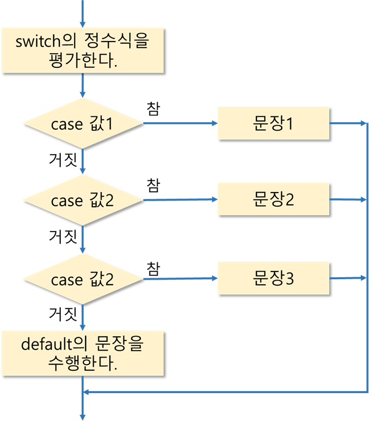 - 실수로 break를 빠뜨리면, break를 만나거나 switch의 끝을 만날 때까지 나타나는 모든 문장들을 수행한다.