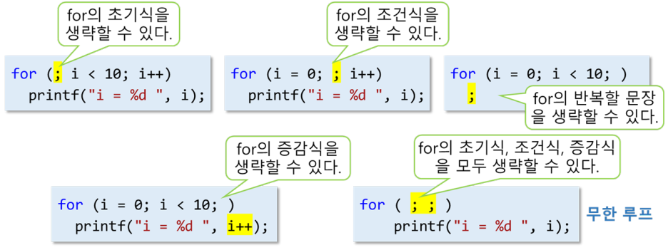 - 초기식, 조건식, 증감식과 반복할 문장은 모두 생략할 수 있다.