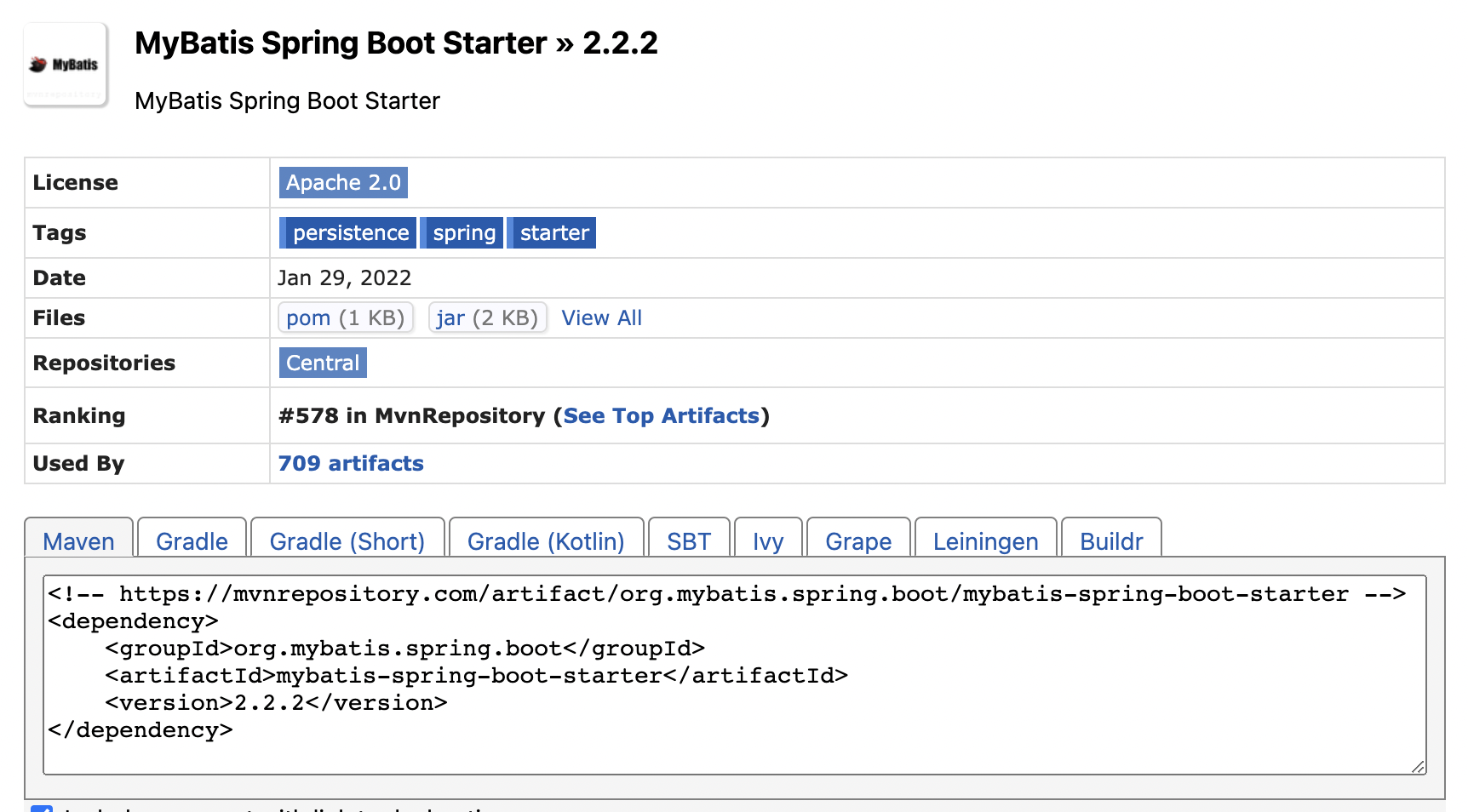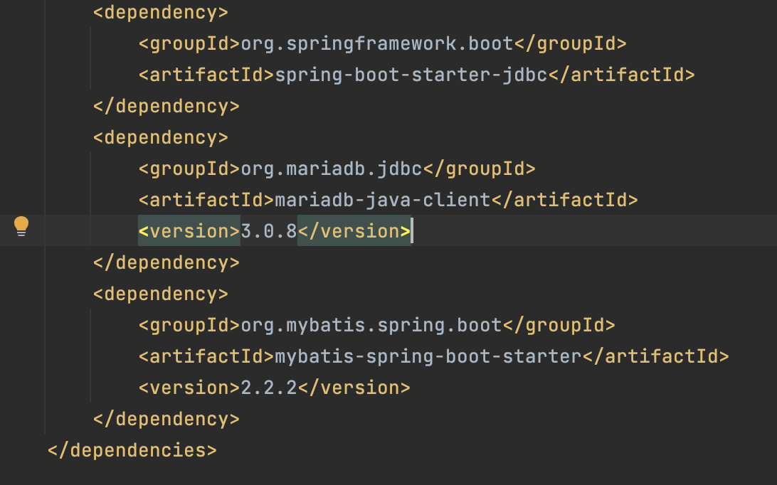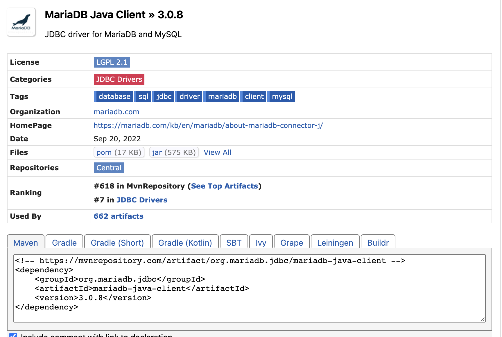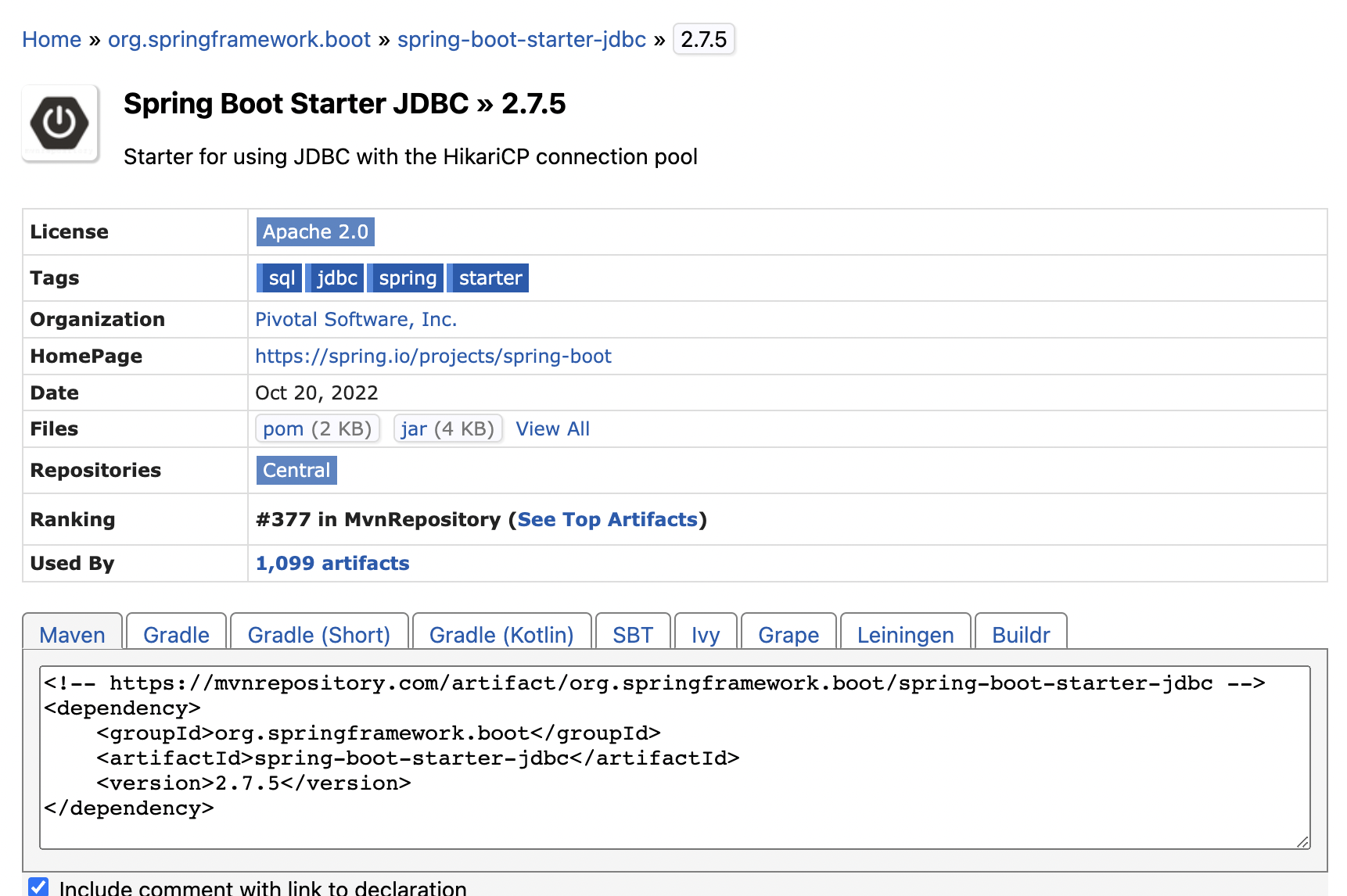 Spring Boot/학습내용 [공통] 의존성 추가 root_go 2022. 10. 31. 13:18 https://mvnrepository.com/ Spring Boot Starter JDBC MariaDB Java Client MyBatis Spring Boot Starter