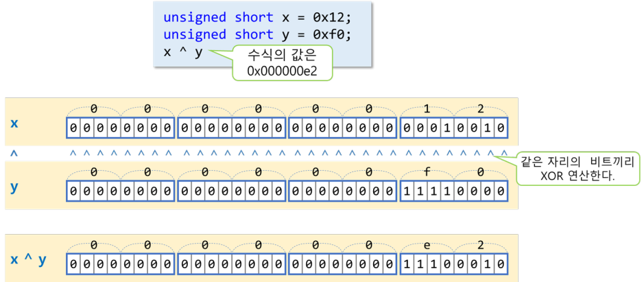 - &, |, ^ 연산자는 피연산자의 데이터형이 일치하지 않으면 형 변환을 수행하여 같은 형으로 만든 후, 피연산자의 각 비트에 대하여 비트 논리 연산을 수행한다.
